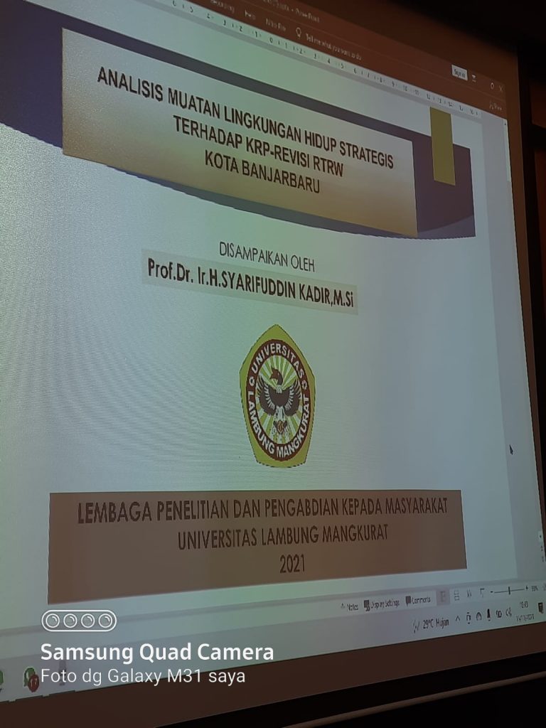 Banjarbaru 11 November 2021. Rapat Analisis Muatan Lingkungan Hidup Strategis Terhadap KRP-Revisi RTRW Kota Banjarbaru yang disampaikan oleh Prof.Dr. Ir.H.Syarifuddin Kadir,M.Si, rapat diselenggarakan oleh Lembaga Penelitian dan Pengabdian Kepada Masyarakat Universitas Lambung Mangkurat yang mana rapat tersebut dihadiri oleh perwakilan dari Dinas Komunikasi dan Informatika Kota Banjarbaru, Bapak Khairurrijaal,SSTP dan bapak Herry Isdaryoko, S.AP selaku kepala bidang komunikasi dan informatika publik.