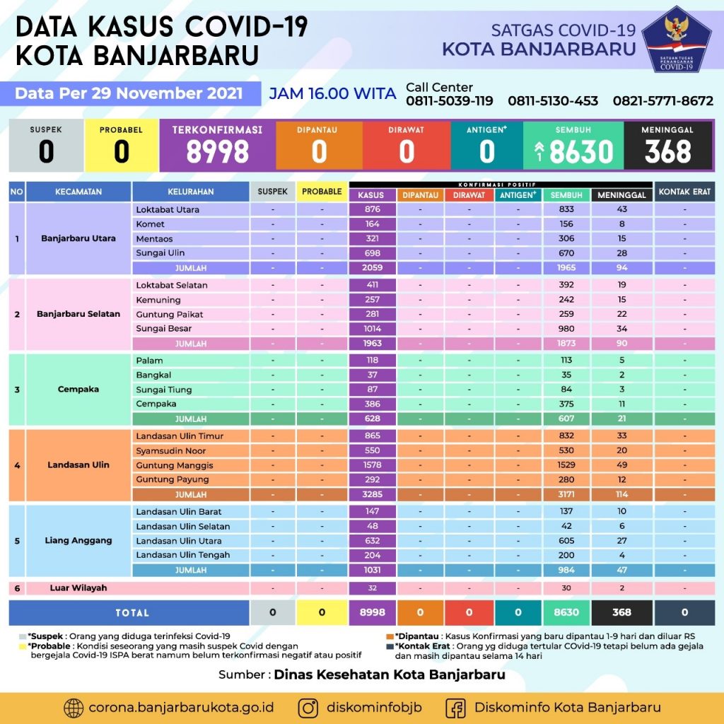 Data Sebaran Covid-19 Kota Banjarbaru Senin, 29 November 2021