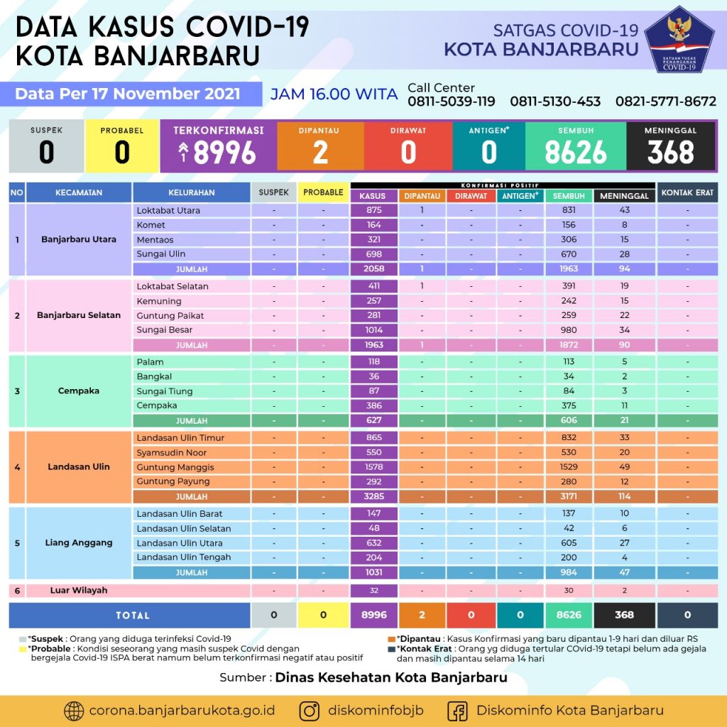 Data Sebaran Covid-19 Kota Banjarbaru Rabu, 17 November 2021