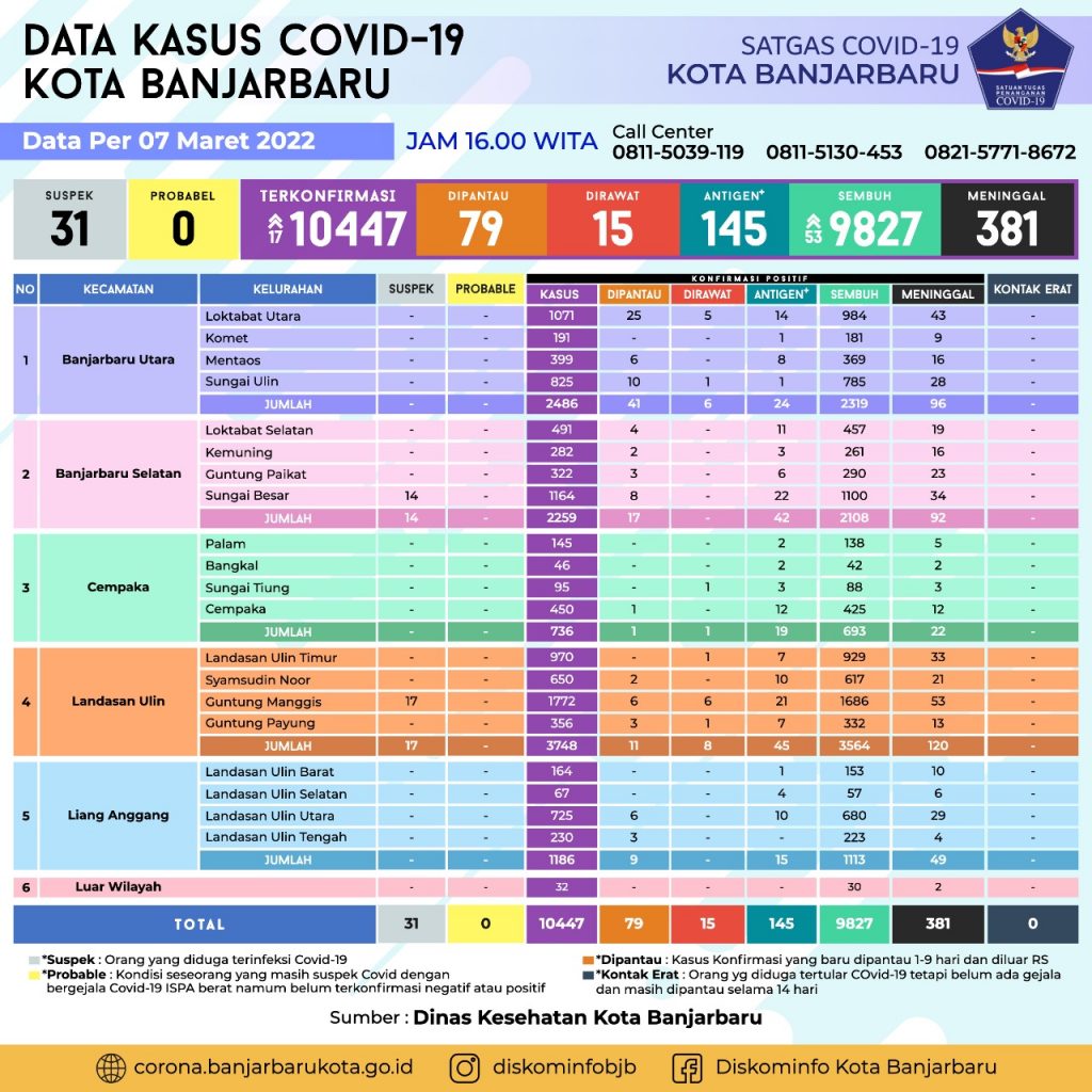 Tim Gugus Tugas akan menyampaikan data yang masuk tentang perkembangan sebaran covid-19 di Kota Banjarbaru periode 07 maret 2022 pukul 16.00 wita :