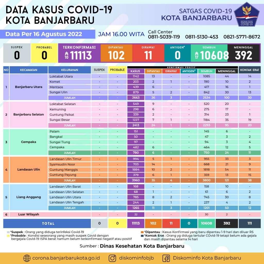 Tim Gugus Tugas akan menyampaikan data yang masuk tentang perkembangan sebaran covid-19 di Kota Banjarbaru periode 16 Agustus 2022 pukul 16.00 wita :