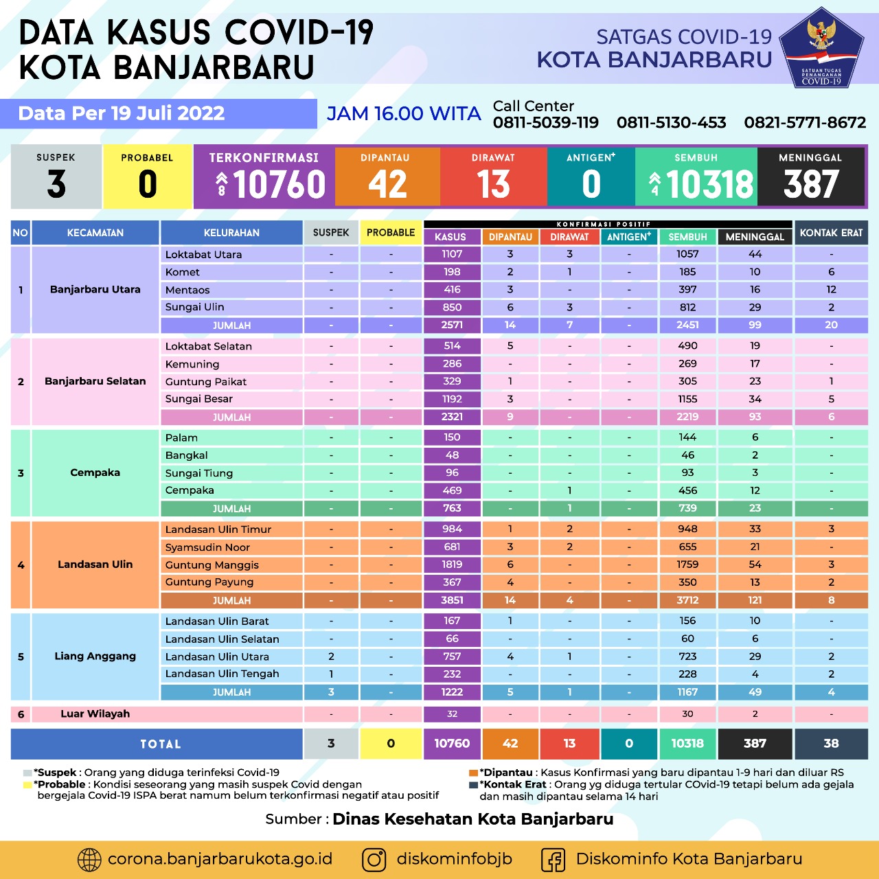 Tim Gugus Tugas akan menyampaikan data yang masuk tentang perkembangan sebaran covid-19 di Kota Banjarbaru periode 18 JuLi 2022 pukul 16.00 wita :